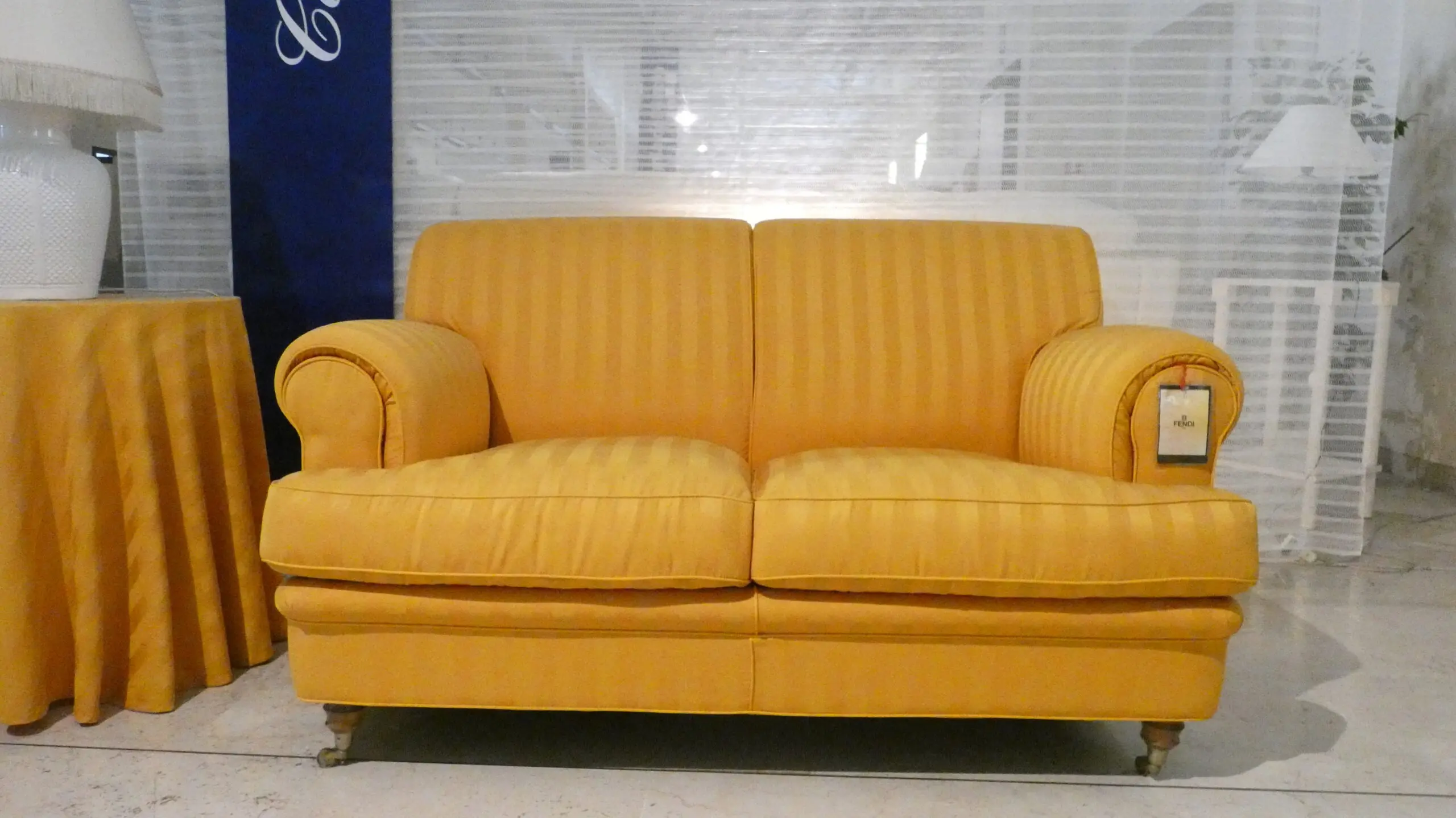 Tessuto a righe Fendi giallo oro. Un’esclusiva dallo stile unico: divano classico 2 posti rivestito in tessuto Fendi giallo oro, con piedini in ottone girevoli ispirati all’800. Un pezzo di carattere, per salotti raffinati.