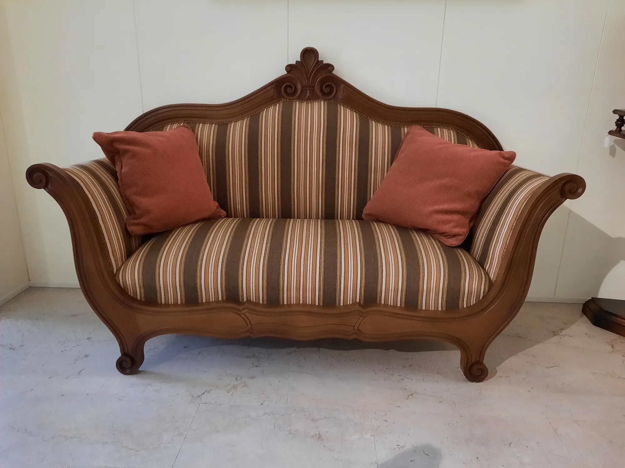 Fusto in legno a vista intagliato. Realizzato interamente a mano, presenta intagli decorativi su tutta la struttura. Il tessuto a righe conferisce un’eleganza rétro, perfetta per ambienti importanti.