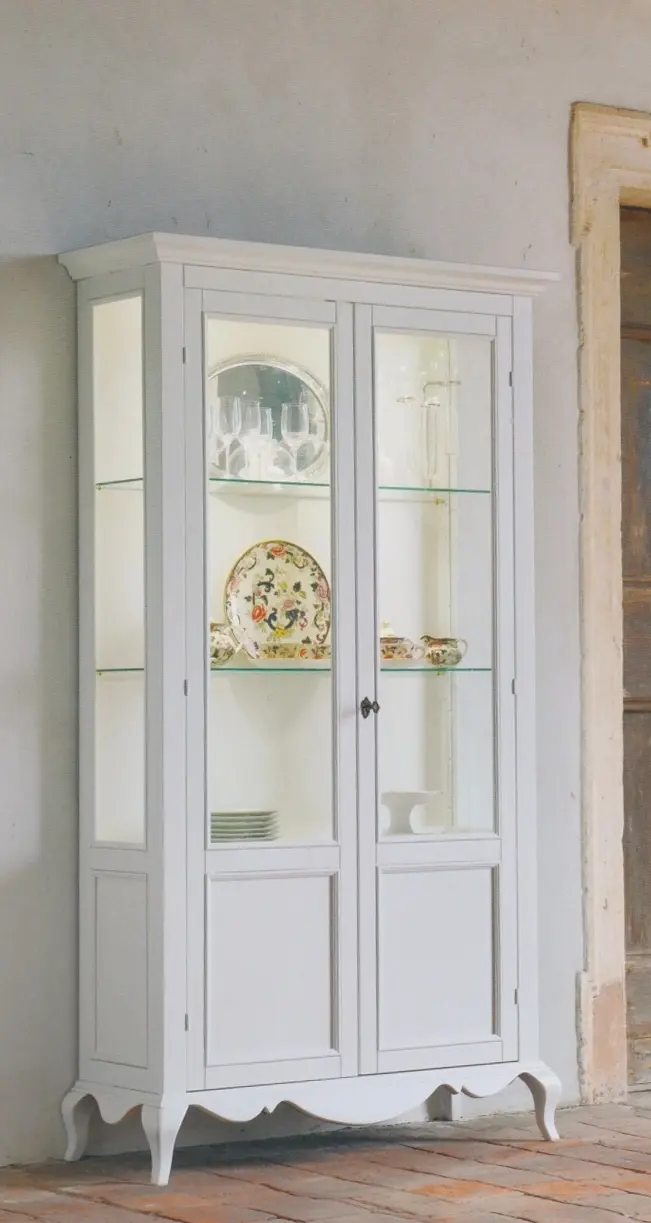 Mobile vetrina laccata bianca 2 ante con fianchi laterali in vetro.