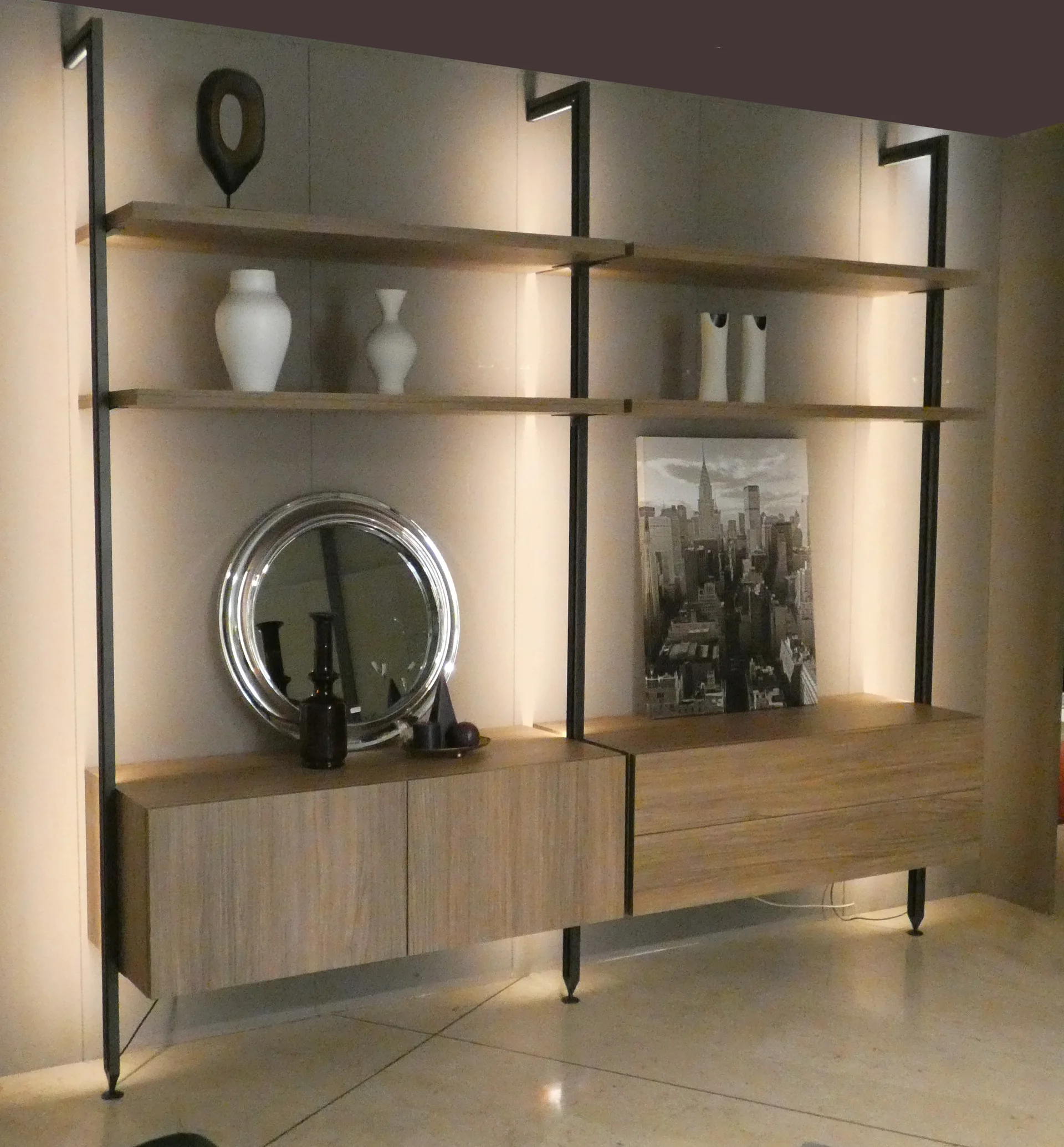 La particolare soluzione dei ripiani delle vetrine e dei vani a giorno consente di avere una illuminazione a led degli schienali, per un’estetica elegante e ricercata.