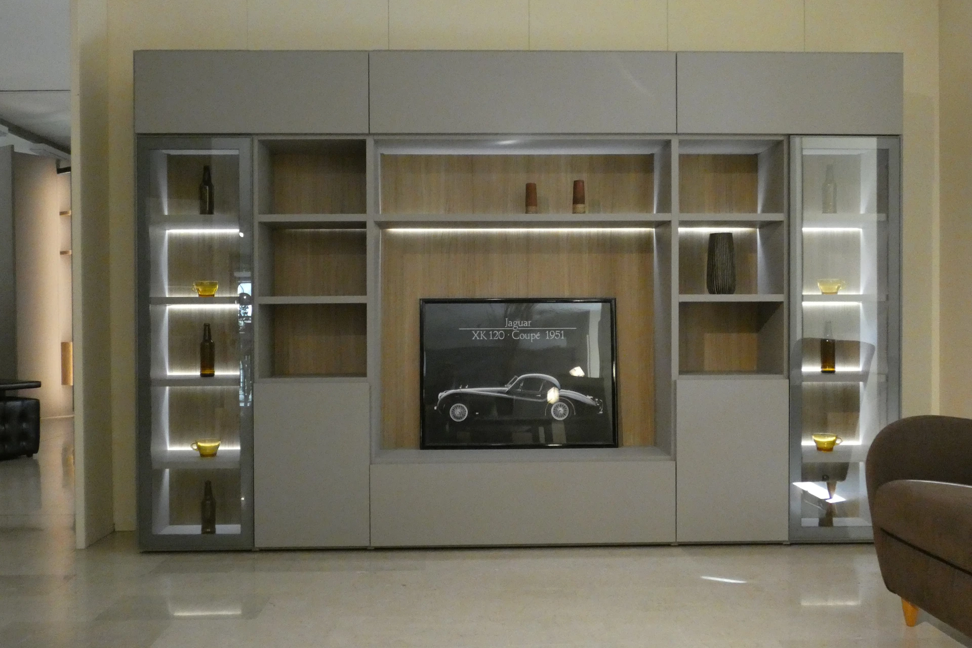 Parete libreria con elementi chiusi e elementi libreria, vano Tv centrale.