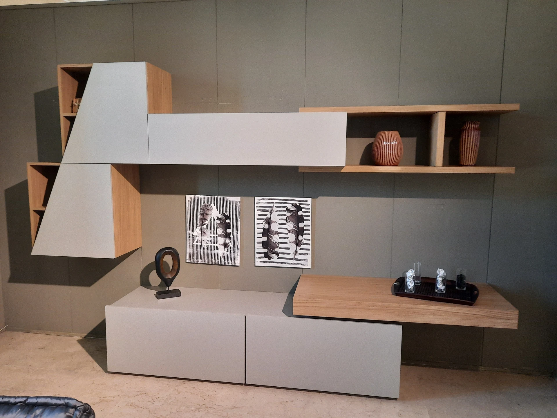 Soggiorno componibile ad elementi tortora opaco con mensole in finitura rovere.